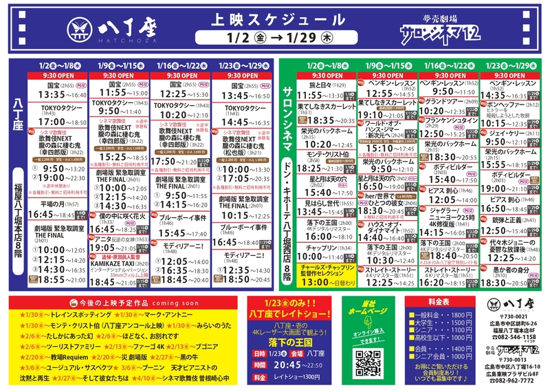 長い酷暑の夏、雨もあり、そして寒さの冬のなか、また経済不況もあり、足しげくサロンシネマと八丁座にお越し頂き誠に有難うございます。
